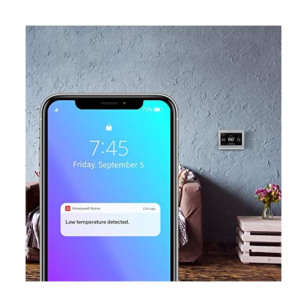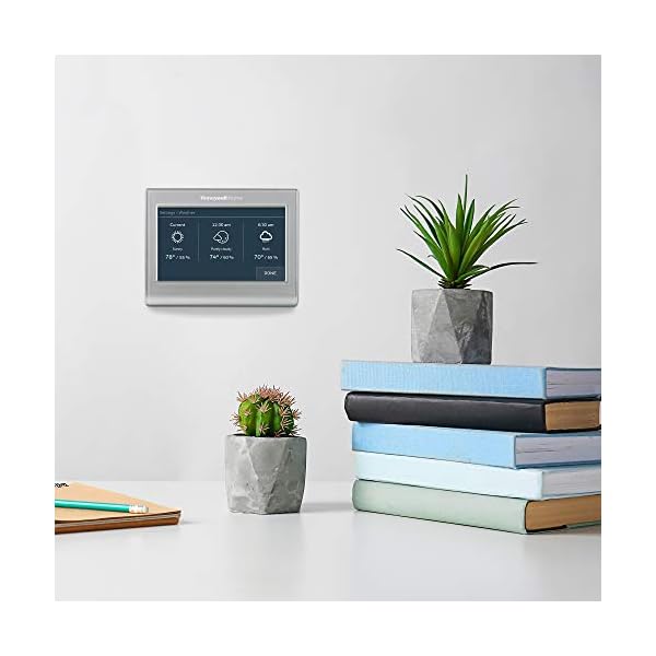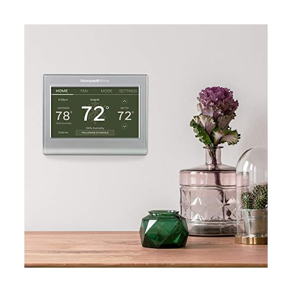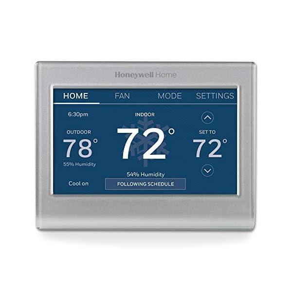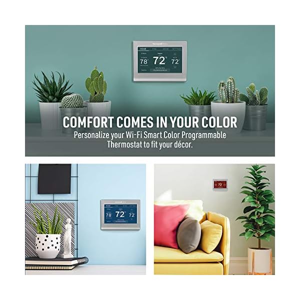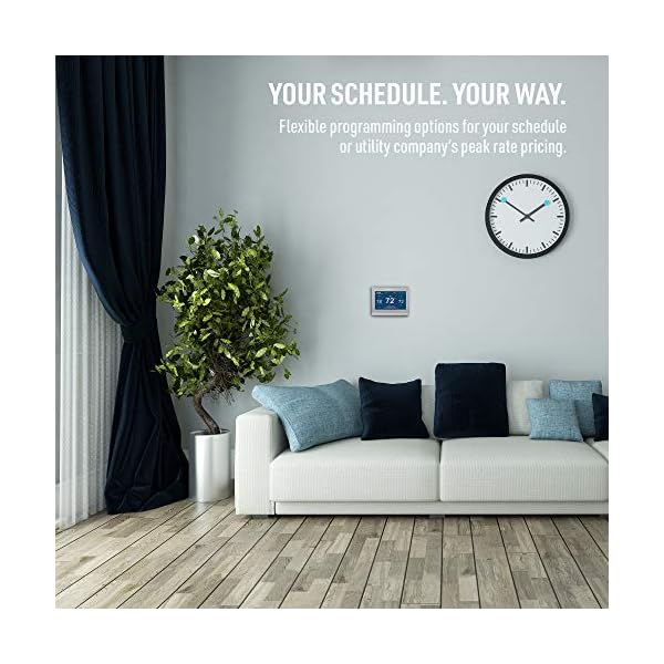 This second generation Wi-Fi smart color thermostat is ideally suited for the connected home. Its packed with smart features, a customizable color touch screen and a simple, DIY set up. You can control the thermostat using the touch screen and change the background color to match your paint color or personal preference or use your tablet or computer. All you need is a Wi-Fi connection, or use the free app for smartphone/Tablet to mange the thermostat remotely. Intelligent alerts help to keep your equipment running at peak performance by sending you air filter and humidifier pad Change reminders, and also to notify you of extreme high or low indoor temperatures and humidity. 1) View local weather – daily forecast on screen and 5 – Day forecasts on app, 2) fully flexible progamming options, 3) Auto change from heat to cool – automatically determines if your home needs heating or cooling to provide maximum comfort, 4) reliable, secure network ensures app availability, 5) permanent/temporary/vacation hold – adjust temperature to suit your schedule. Does not work with heat pumps with electric baseboard heat (120-240 volts)