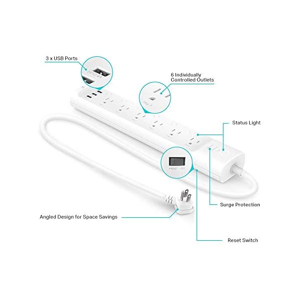 6 smart outlets: Independently control 6 smart outlets, and charge 3 devices with built in USB ports; Ideal for controlling electronics in your home, home office, or small business
