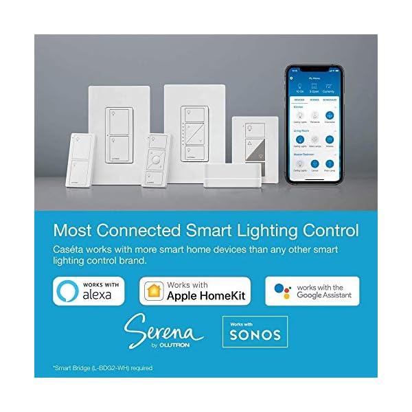 CONTROL YOUR WAY: Caseta puts the smarts in the switch so you can control a variety of ways – via the free Lutron app, your voice or from the wall; Schedule lights to change at set times or activate scenes with the touch of a button (smart bridge required)